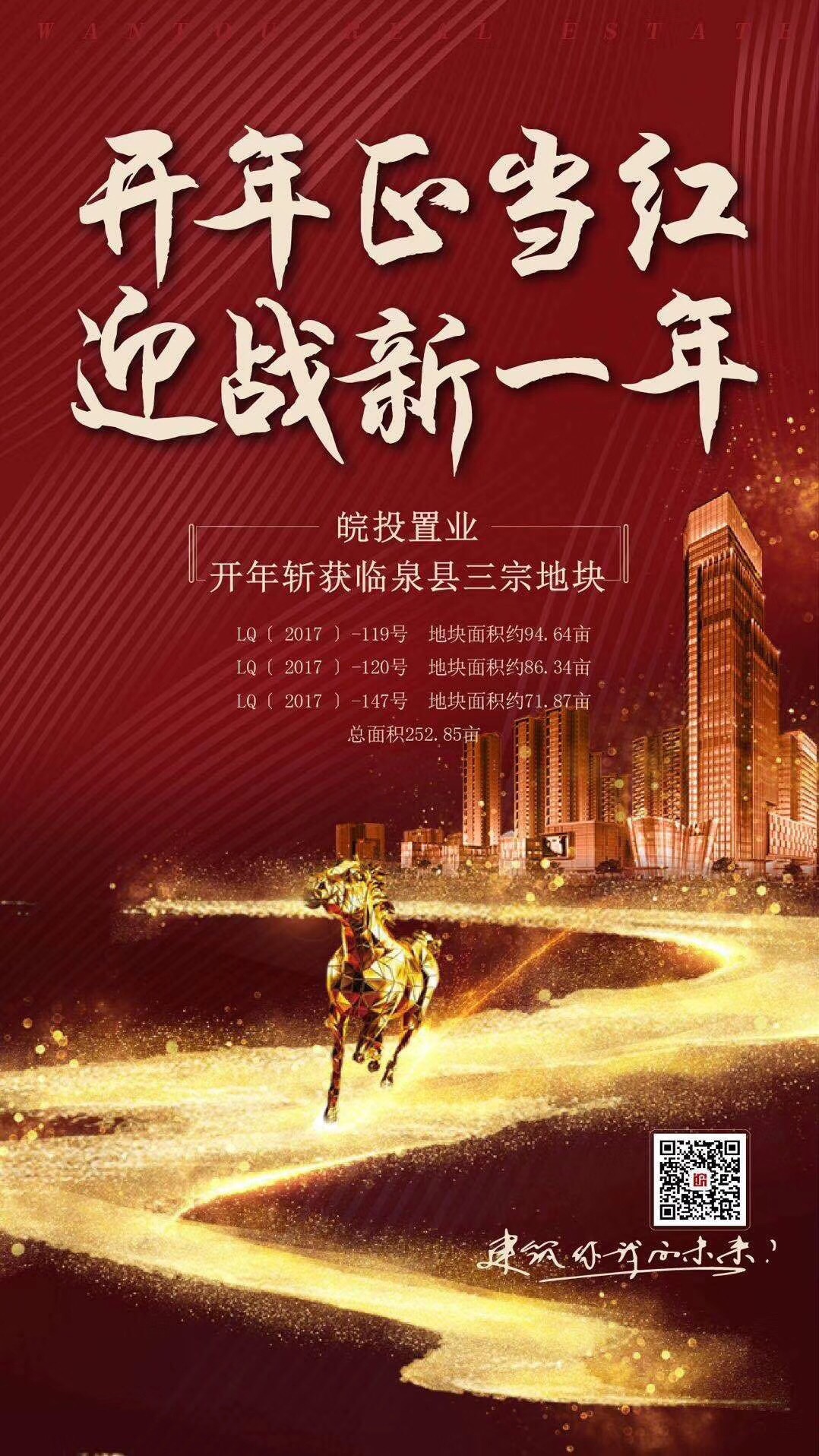 2018年1月2日下午,皖投置業(yè)成功競得臨泉縣LQ〔2017〕-119號地塊,面積為94.64畝;LQ〔2017〕-120號地塊,面積為86.34畝;LQ〔2017〕-147號地塊,面積為71.87畝。合計總面積252.85畝。