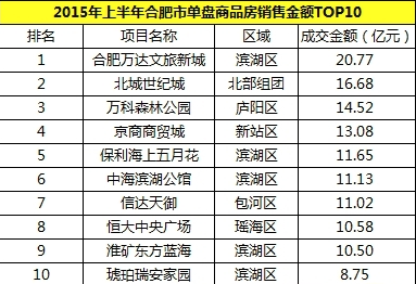 2015年7月2日深夜,《2015年合肥單盤商品房成交金額排行榜》權(quán)威發(fā)布,上半年合肥樓市雖然有所下滑,整體呈現(xiàn)“價(jià)升量跌”的態(tài)勢(shì),但單盤商品房成交金額仍不乏亮點(diǎn),其中最引人注目的當(dāng)屬合肥萬達(dá)文化旅游城,以20.77億元的絕對(duì)優(yōu)勢(shì)榮登榜首;而北城世紀(jì)城因體量巨大而以單盤商品房成交金額16.68億元位列第二;廬陽區(qū)萬科森林公園以高人氣高銷量獲單盤成交金額14.52億元排名第三。