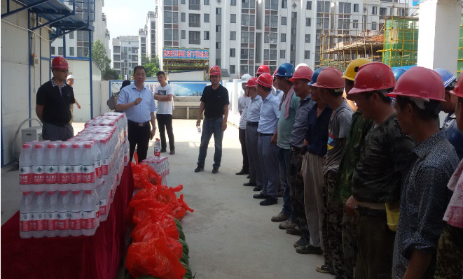 在各項(xiàng)目施工現(xiàn)場,帶隊(duì)領(lǐng)導(dǎo)、公司副總經(jīng)理丁昌華首先對在高溫下堅(jiān)持工作的一線職工表示親切慰問,叮囑大家在完成工作任務(wù)的同時(shí),要注意自身的身體健康和生產(chǎn)安全。他要求,各地塊施工單位要進(jìn)一步加強(qiáng)高溫季節(jié)職工勞動(dòng)保護(hù)和防暑降溫工作,要加強(qiáng)對高溫、高濕、高空、露天作業(yè)場所的監(jiān)督檢查,督促各參建單位嚴(yán)格執(zhí)行高溫作業(yè)的有關(guān)規(guī)定,調(diào)整好作業(yè)時(shí)間,確保高溫期間一線職工的生產(chǎn)安全和生活健康。為切實(shí)解決工地高溫作業(yè)困難,公司還在各項(xiàng)目現(xiàn)場發(fā)放了“夏日送清涼”的慰問品。