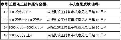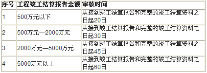 (2)審核工程竣工結(jié)算時(shí)限 發(fā)包人應(yīng)按以下規(guī)定時(shí)限進(jìn)行審核,并提出審核意見。
