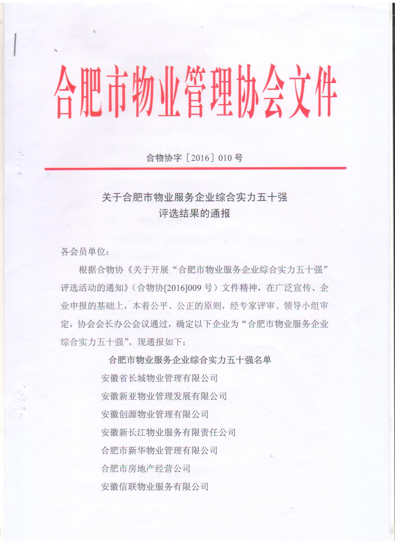 根據(jù)合肥市物業(yè)協(xié)會《關于開展“合肥市物業(yè)服務企業(yè)綜合實力五十強”評選活動的通知》(合物協(xié)[2016]009號)文件精神,在廣泛宣傳、企業(yè)申報的基礎上,本著公平、公正的原則,經(jīng)專家評審、領導小組審定,協(xié)會會長辦公會議通過,安徽外灘物業(yè)管理有限公司與其他多家企業(yè)一起被評為“合肥市物業(yè)服務企業(yè)綜合實力五十強”企業(yè)。