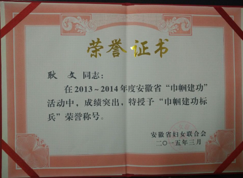 近日,安徽省婦女聯(lián)合會傳來喜訊,耿文同志在2013-2014年度安徽省“巾幗建功”活動中,成績突出,被授予“巾幗建功標(biāo)兵”榮譽(yù)稱號。