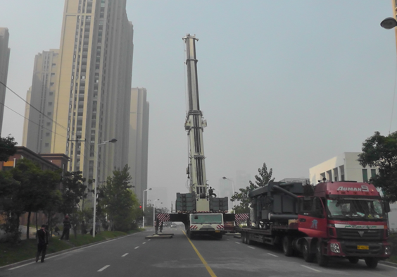 2012年10月28日,湖東景園項目制冷站泵房內(nèi)溴化鋰機組正式開始吊運進場。上午8時許,號稱安徽第一,最大起重量為500噸的吊車??吭诤|景園項目A地塊施工圍墻外預(yù)定工作區(qū)域,湖東景園項目部、熱電集團工程分公司和監(jiān)理公司對吊裝前安全操作進行最后一次現(xiàn)場溝通并提出相關(guān)要求,而后,吊車在進行了必要的測試和負重等準備工作后,10時許吊運工作正式開始。