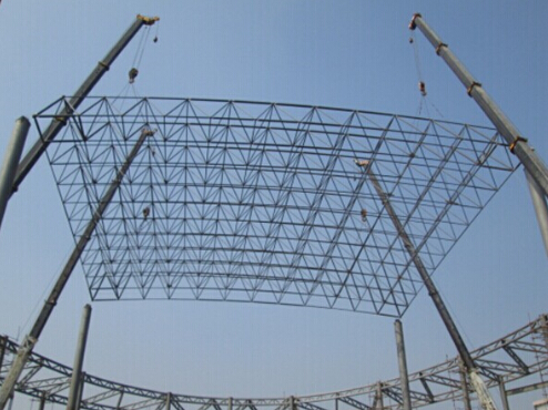蚌埠(皖北)國(guó)際汽車城展示中心鋼結(jié)構(gòu)工程的屋蓋主結(jié)構(gòu)為螺栓球網(wǎng)架結(jié)構(gòu),整體面積約6400 平方米,網(wǎng)殼采用正放四角錐雙層球面網(wǎng)殼,矢高2.38-3.3m,節(jié)點(diǎn)采用螺栓球節(jié)點(diǎn),網(wǎng)架支撐體系為鋼框架結(jié)構(gòu),支座為平板支座,部分采用橡膠墊支座,網(wǎng)架主體結(jié)構(gòu)全部重量約220。