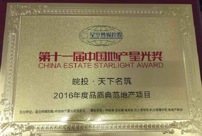 2016年12月28日下午,第十一屆中國(guó)地產(chǎn)星光獎(jiǎng)?lì)C獎(jiǎng)典禮在合肥香格里拉大酒店盛大舉行,在歷經(jīng)千萬(wàn)網(wǎng)友的投票評(píng)選以及省房協(xié)、星空地產(chǎn)研究院等組成的專家評(píng)審團(tuán)審定后,皖投安慶天下名筑脫穎而出,榮獲“2016年度品質(zhì)典范地產(chǎn)項(xiàng)目”。