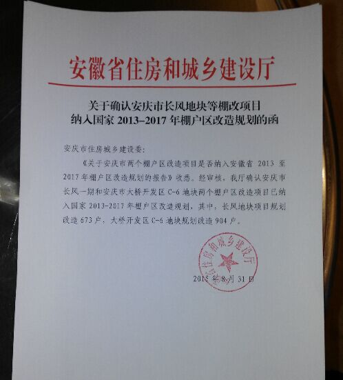 2015年8月31日,皖投同安公司兩個(gè)在建棚改項(xiàng)目安慶市長(zhǎng)風(fēng)地塊和大橋開發(fā)區(qū)C-6地塊獲安徽省住房和城鄉(xiāng)建設(shè)廳正式確認(rèn),納入國(guó)家2013-2017年棚戶區(qū)改造規(guī)劃。