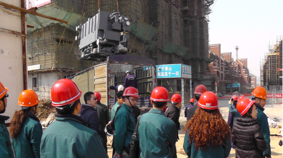 天下錦城采取集中供暖、供冷雙聯(lián)供中央空調(diào)形式,實(shí)現(xiàn)經(jīng)濟(jì)、節(jié)能、環(huán)保,此次施工的R4地塊空調(diào)建筑面積為7.2萬平方米,空調(diào)主機(jī)位于9號樓地下室,主機(jī)下地下室和地下室路面拖運(yùn)是工程施工重點(diǎn)。吊裝的2臺空調(diào)主機(jī)搬入重分別是23T和7.4T,這樣的重量和高度要求讓施工現(xiàn)場氛圍緊張。過程中,領(lǐng)導(dǎo)們有條不紊組織、調(diào)動(dòng)著相關(guān)人員;操作人員認(rèn)真傾聽指示,聚精會(huì)神地操作設(shè)備;工作人員也是凝神聚力,全力配合做好各項(xiàng)工作。隨著吊裝機(jī)緩緩下降,兩臺溴化鋰機(jī)組一一被順利地放到目標(biāo)位置,天下錦城R4地塊雙聯(lián)供工程溴化鋰機(jī)組吊裝工程順利完成。