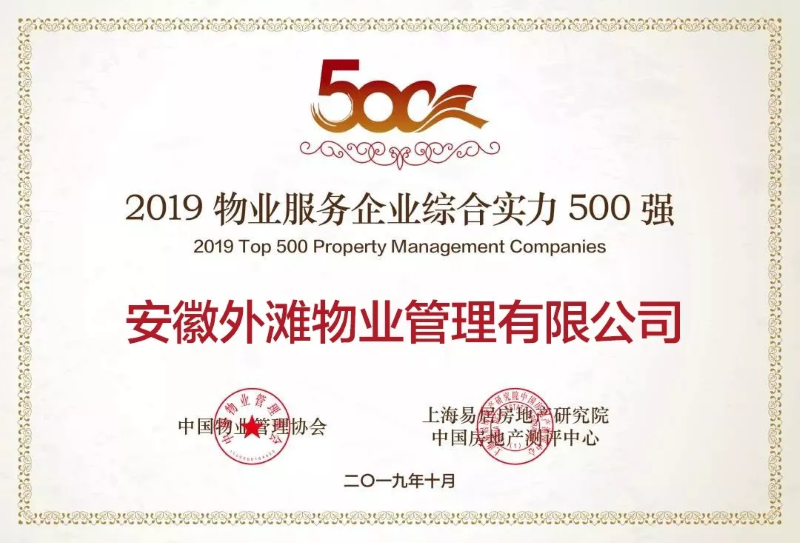 安徽外灘物業(yè)榮獲“2019中國物業(yè)服務企業(yè)綜合實力500強”