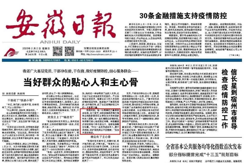 張玉杰作為一名黨員和退伍軍人,他實(shí)現(xiàn)了自己入黨時(shí)的宣言,在困難面前,勇往直前,發(fā)揮了黨員先鋒模范作用,其身體力行也深深的影響了其他同事。在各崗位默默工作的外灘物業(yè)人,也將堅(jiān)守在各自的崗位上,貢獻(xiàn)自己一份平凡的力量,但大家都堅(jiān)信偉大的祖國必將打贏這場(chǎng)沒有銷煙的殊戰(zhàn)“疫”。優(yōu)異的工作表現(xiàn)在安徽日?qǐng)?bào)2月2日頭版《我省廣大基層黨員、干部沖在前,干在前、做在疫情防控,細(xì)心服務(wù)群眾—當(dāng)好群眾的貼心人和主心骨》中被提名表揚(yáng)。