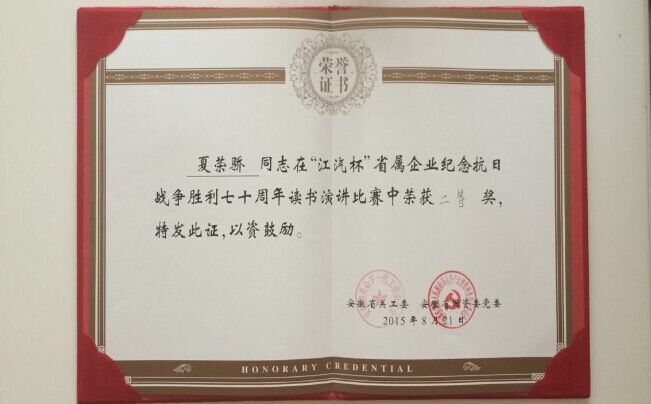 2015年8月21日,由省關(guān)工委、省國資委黨委、省國資委關(guān)工委聯(lián)合舉辦的大型演講比賽在江汽集團(tuán)研發(fā)中心隆重舉行,三十余家省國資企業(yè)參賽,經(jīng)過激烈角逐,代表我司及集團(tuán)公司參賽的夏榮驕同志以一篇《回憶里選擇未來》打動(dòng)了評(píng)委及現(xiàn)場(chǎng)觀眾,獲得評(píng)委高度贊揚(yáng)并榮獲二等獎(jiǎng),充分展示了國企員工的風(fēng)采,為集團(tuán)公司和我司爭得了榮譽(yù)。