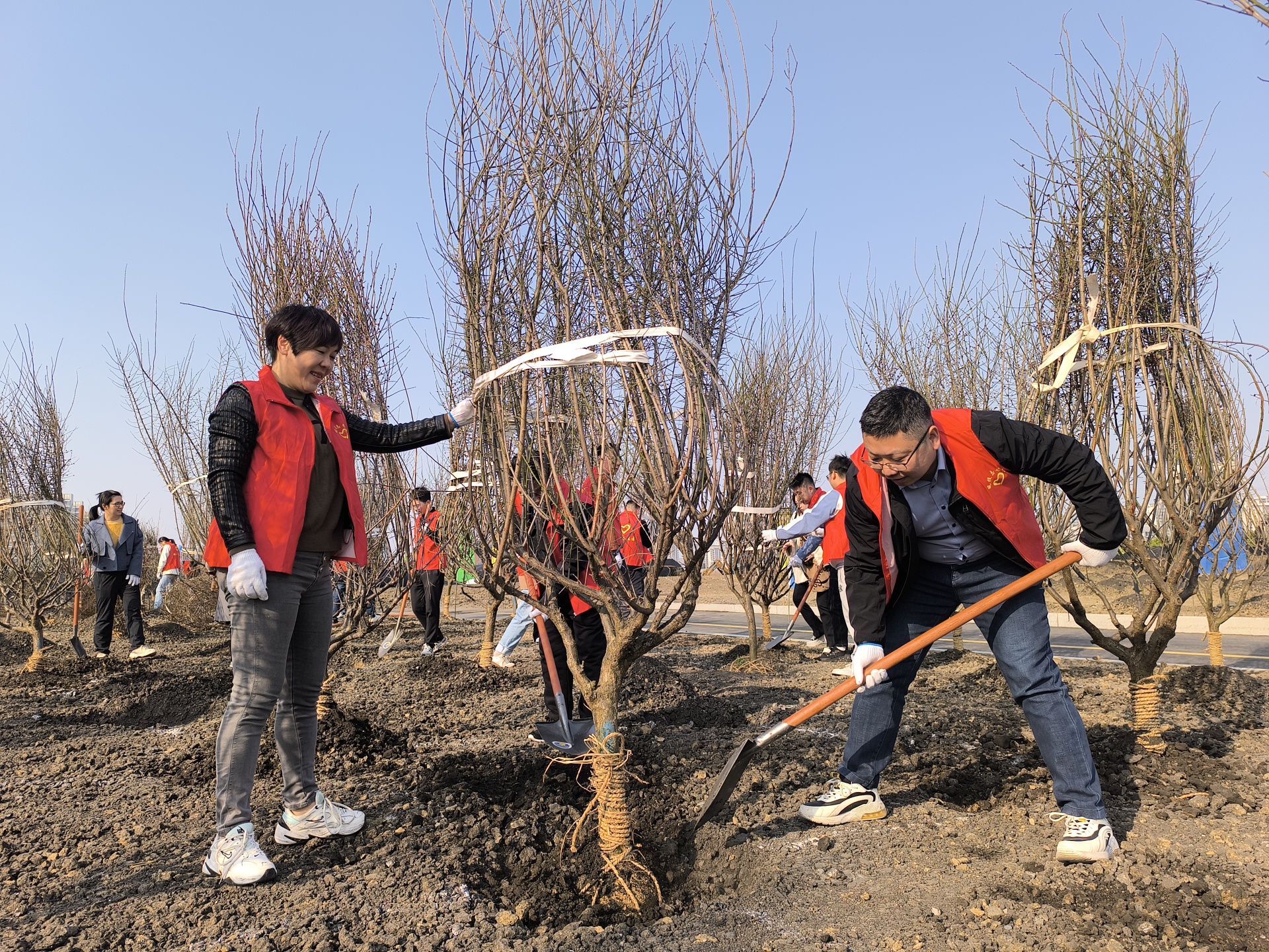 活動(dòng)現(xiàn)場(chǎng),大家分工協(xié)作、相互配合,一起揮鍬鏟土、扶苗正樹、填土踩實(shí)、提桶澆水,干勁十足。經(jīng)過一下午的辛勤勞動(dòng),一排排新栽的紅梅樹苗在春風(fēng)中昂然挺立,展現(xiàn)出蓬勃生機(jī)。